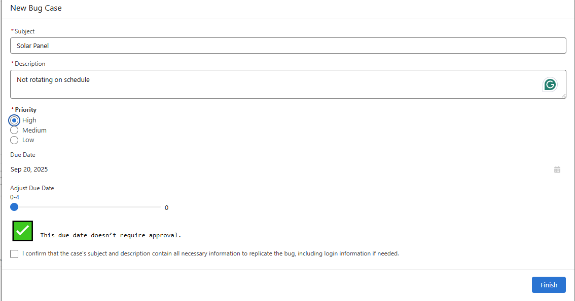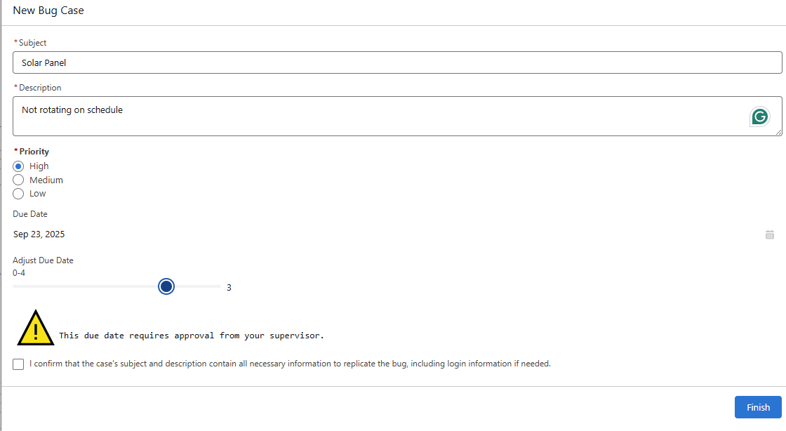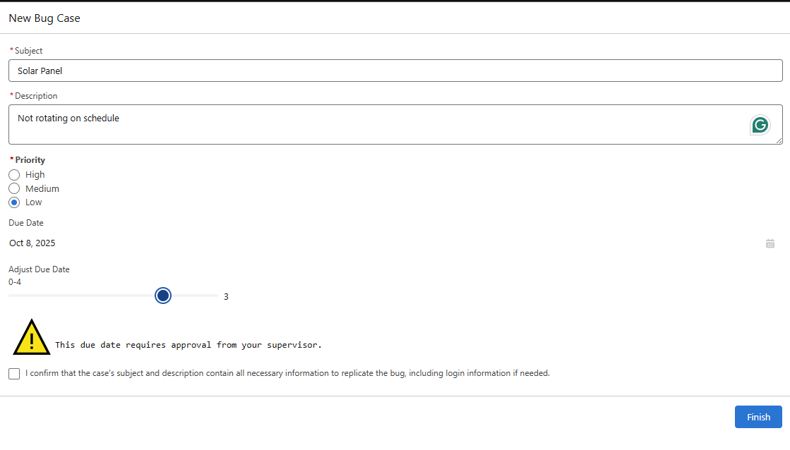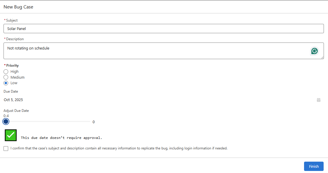 A screen flow for case creation that dynamically updates fields and messages based on user input—for example, adjusting due dates by priority, disabling fields after confirmation, and displaying approval warnings in real time.