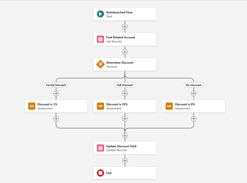 A Flow that calculates and applies discounts on Opportunities based on account criteria. The automation ensures consistent pricing logic, reduces manual entry, and streamlines the sales process.